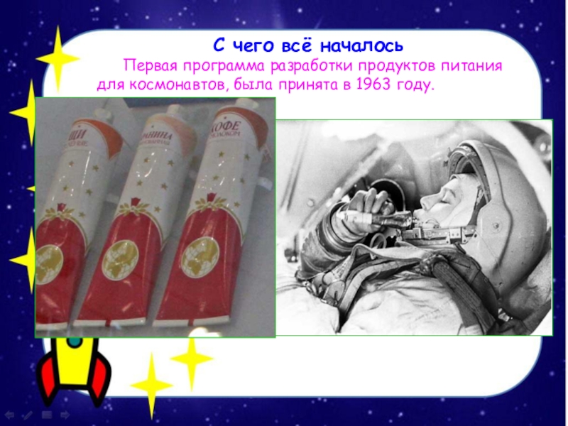 С чего всё началось Первая программа разработки продуктов питания для космонавтов, была принята в 1963 году.
