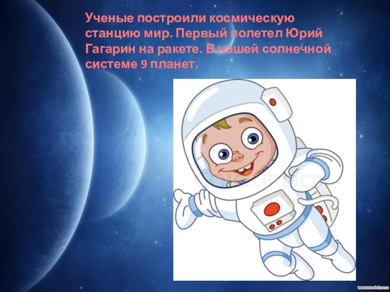 Ученые построили космическую станцию мир. Первый полетел Юрий Гагарин на ракете. В нашей солнечной системе 9 планет.