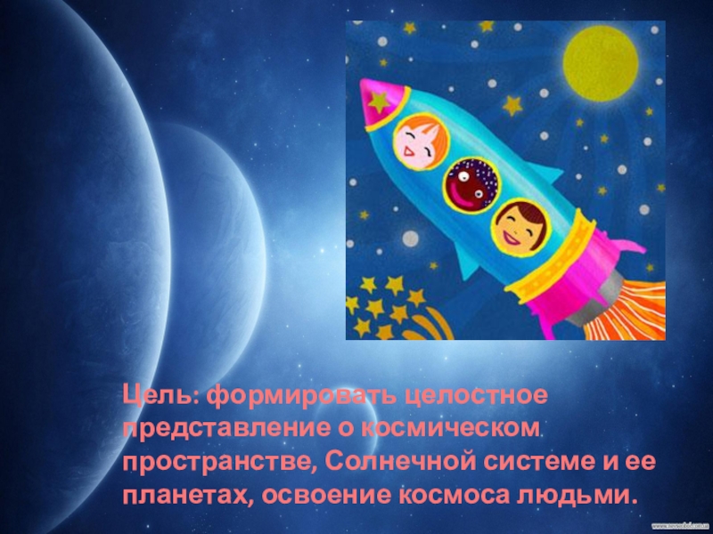 Цель: формировать целостное представление о космическом пространстве, Солнечной системе и ее планетах, освоение космоса людьми.