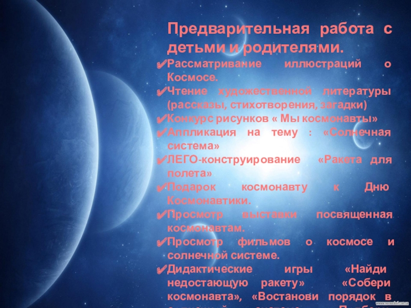 Предварительная работа с детьми и родителями.Рассматривание иллюстраций о Космосе.Чтение художественной литературы (рассказы, стихотворения, загадки)Конкурс рисунков « Мы