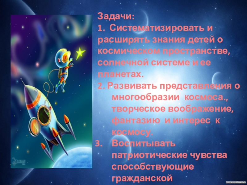 Задачи:1. Систематизировать и расширять знания детей о космическом пространстве, солнечной системе и ее планетах.2. Развивать представления о