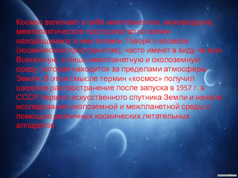 Слайд 8Космос включает в себя межпланетное, межзвездное, межгалактическое пространство со всеми находящимися