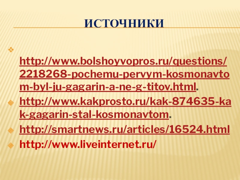 http://www.bolshoyvopros.ru/questions/2218268-pochemu-pervym-kosmonavtom-byl-ju-gagarin-a-ne-g-titov.html.