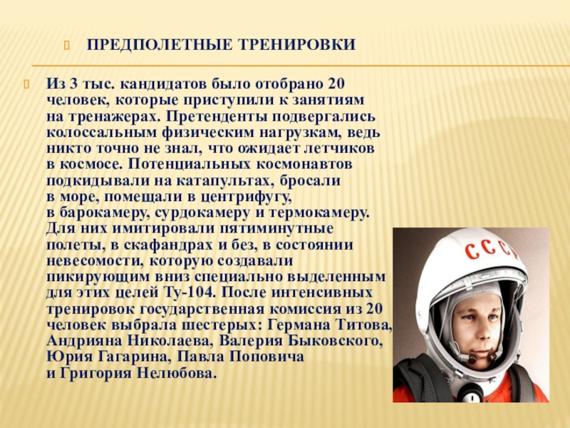 к занятиям на тренажерах. Претенденты подвергались колоссальным физическим нагрузкам, ведь никто точно не знал, что ожидает летчиков в космосе. Потенциальных космонавтов подкидывали на катапультах, бросали в море, помещали в центрифугу, в барокамеру, сурдокамеру и термокамеру. Для них имитировали пятиминутные полеты, в скафандрах и без, в состоянии невесомости, которую создавали пикирующим вниз специально выделенным для этих целей Ту-104. После интенсивных тренировок государственная комиссия из 20 человек выбрала шестерых: Германа Титова, Андрияна Николаева, Валерия Быковского, Юрия Гагарина, Павла Поповича и Григория Нелюбова.