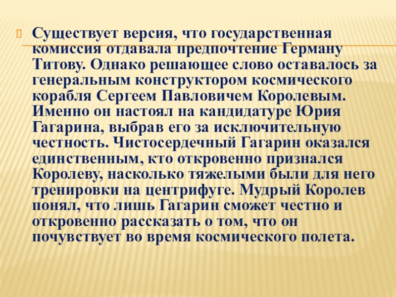 Слайд 23Существует версия, что государственная комиссия отдавала предпочтение Герману Титову. Однако решающее