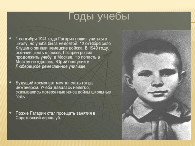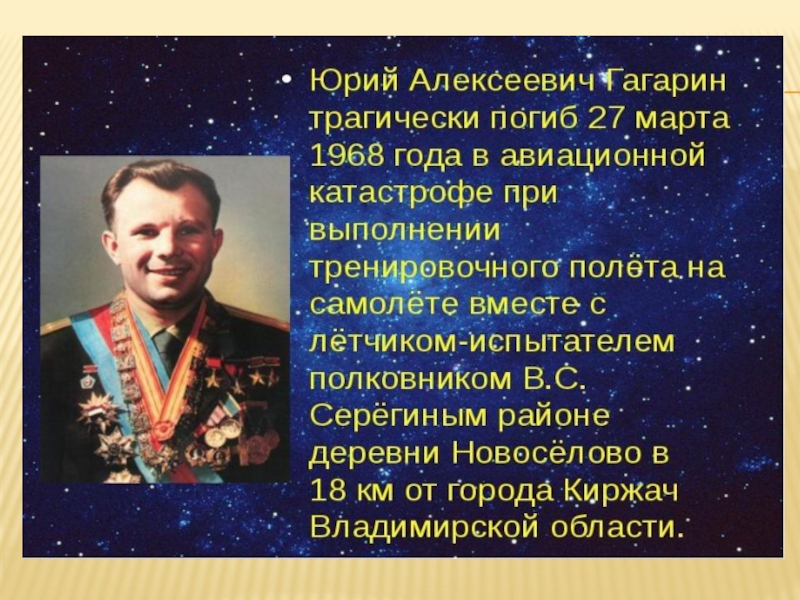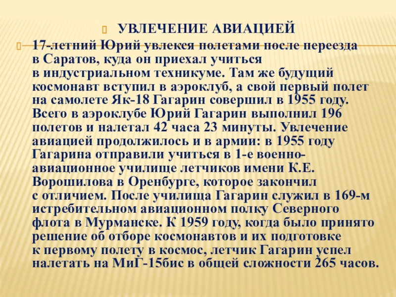 учиться в индустриальном техникуме. Там же будущий космонавт вступил в аэроклуб, а свой первый полет на самолете Як-18 Гагарин совершил в 1955 году. Всего в аэроклубе Юрий Гагарин выполнил 196 полетов и налетал 42 часа 23 минуты. Увлечение авиацией продолжилось и в армии: в 1955 году Гагарина отправили учиться в 1-е военно-авиационное училище летчиков имени К.Е. Ворошилова в Оренбурге, которое закончил с отличием. После училища Гагарин служил в 169-м истребительном авиационном полку Северного флота в Мурманске. К 1959 году, когда было принято решение об отборе космонавтов и их подготовке к первому полету в космос, летчик Гагарин успел налетать на МиГ-15бис в общей сложности 265 часов.