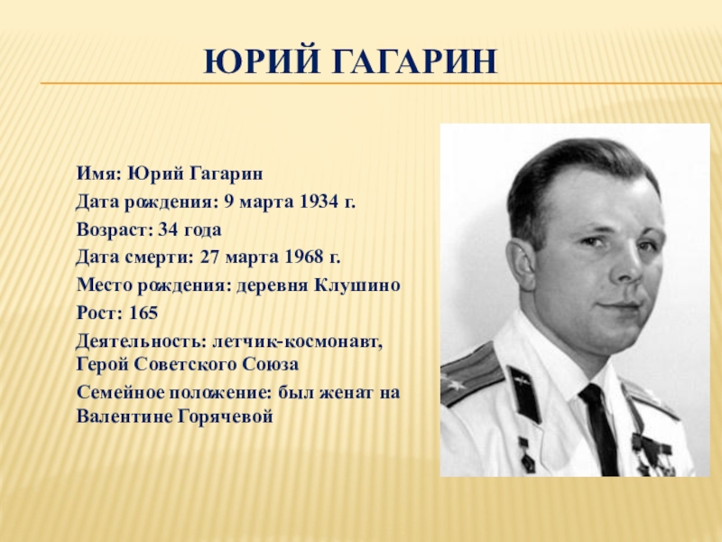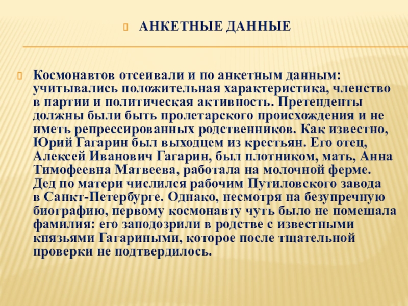 и политическая активность. Претенденты должны были быть пролетарского происхождения и не иметь репрессированных родственников. Как известно, Юрий Гагарин был выходцем из крестьян. Его отец, Алексей Иванович Гагарин, был плотником, мать, Анна Тимофеевна Матвеева, работала на молочной ферме. Дед по матери числился рабочим Путиловского завода в Санкт-Петербурге. Однако, несмотря на безупречную биографию, первому космонавту чуть было не помешала фамилия: его заподозрили в родстве с известными князьями Гагариными, которое после тщательной проверки не подтвердилось.