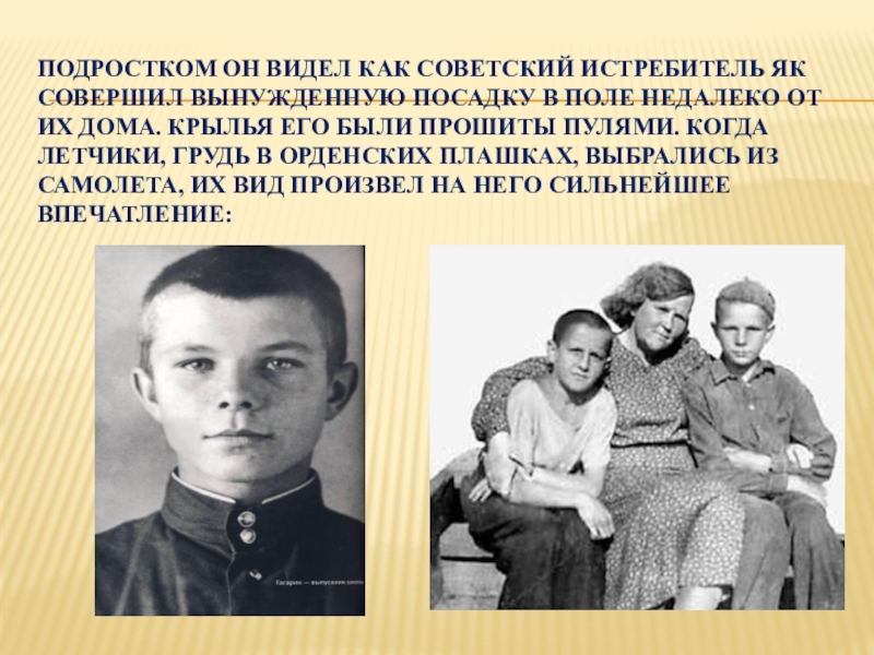 Слайд 5Подростком он видел как советский истребитель Як совершил вынужденную посадку в