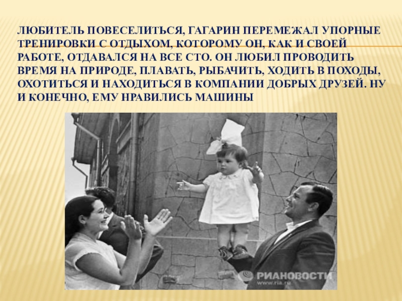 Слайд 34Любитель повеселиться, Гагарин перемежал упорные тренировки с отдыхом, которому он, как