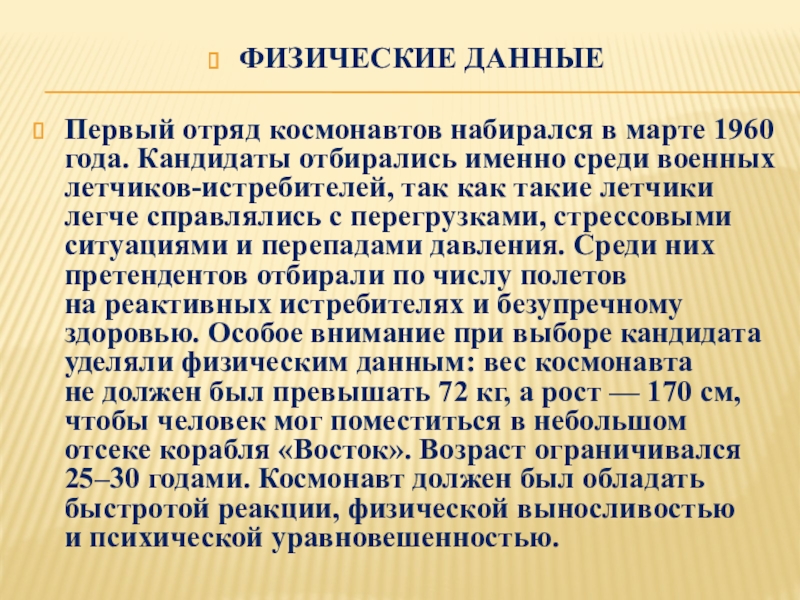 среди военных летчиков-истребителей, так как такие летчики легче справлялись с перегрузками, стрессовыми ситуациями и перепадами давления. Среди них претендентов отбирали по числу полетов на реактивных истребителях и безупречному здоровью. Особое внимание при выборе кандидата уделяли физическим данным: вес космонавта не должен был превышать 72 кг, а рост — 170 см, чтобы человек мог поместиться в небольшом отсеке корабля «Восток». Возраст ограничивался 25–30 годами. Космонавт должен был обладать быстротой реакции, физической выносливостью и психической уравновешенностью.
