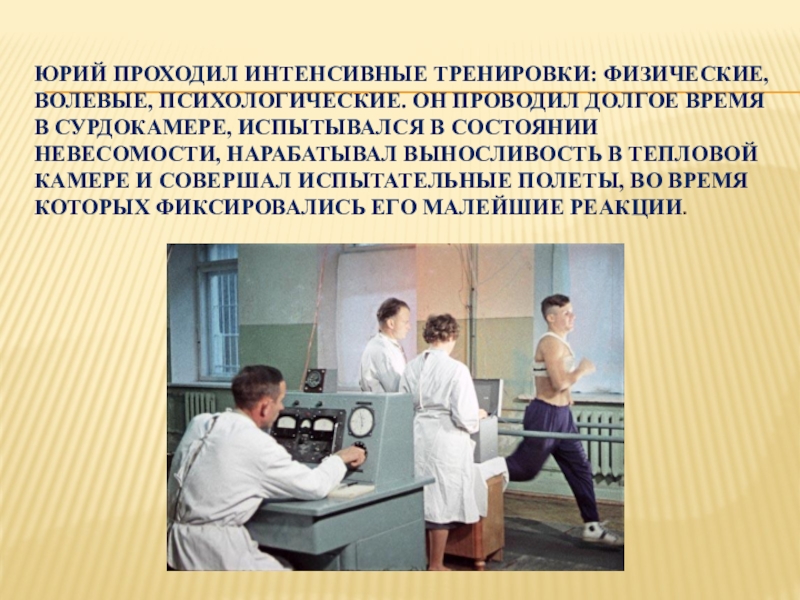 Слайд 20Юрий проходил интенсивные тренировки: физические, волевые, психологические. Он проводил долгое время