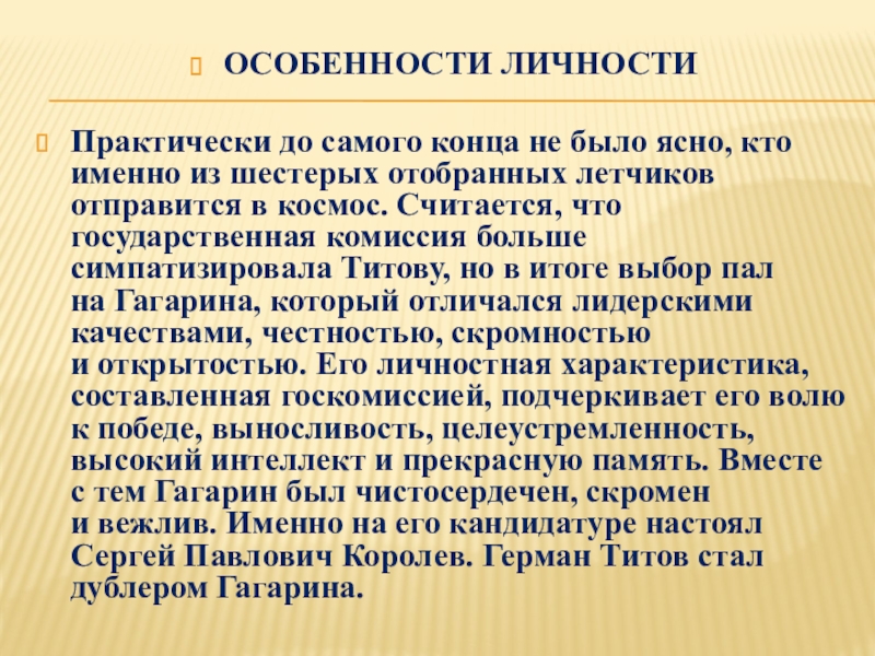 отправится в космос. Считается, что государственная комиссия больше симпатизировала Титову, но в итоге выбор пал на Гагарина, который отличался лидерскими качествами, честностью, скромностью и открытостью. Его личностная характеристика, составленная госкомиссией, подчеркивает его волю к победе, выносливость, целеустремленность, высокий интеллект и прекрасную память. Вместе с тем Гагарин был чистосердечен, скромен и вежлив. Именно на его кандидатуре настоял Сергей Павлович Королев. Герман Титов стал дублером Гагарина.