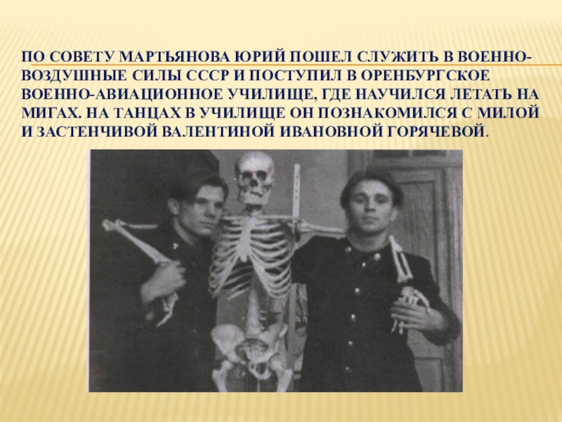 Слайд 10По совету Мартьянова Юрий пошел служить в Военно-воздушные Силы СССР и
