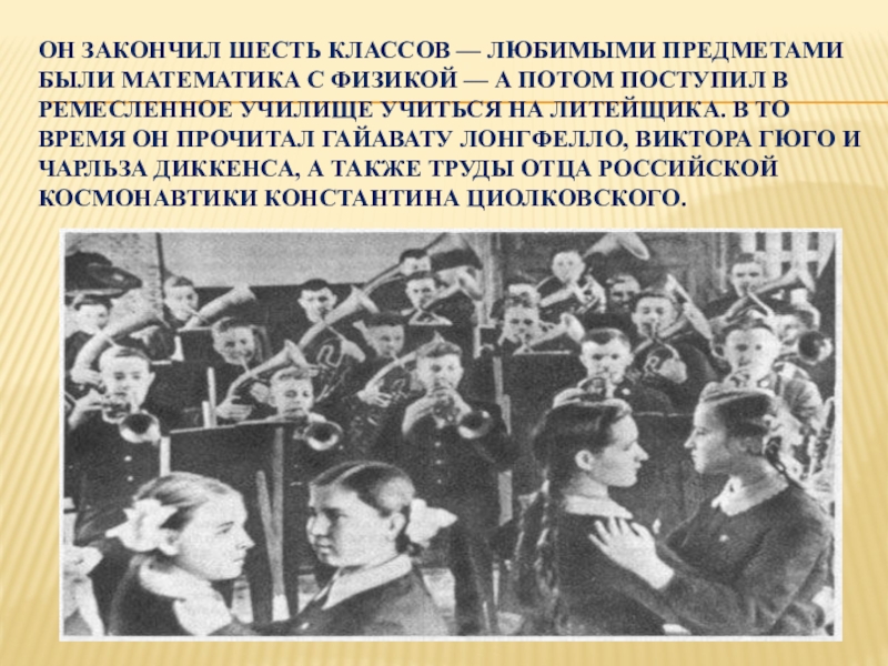 — а потом поступил в ремесленное училище учиться на литейщика. В то время он прочитал Гайавату Лонгфелло, Виктора Гюго и Чарльза Диккенса, а также труды отца российской космонавтики Константина Циолковского.