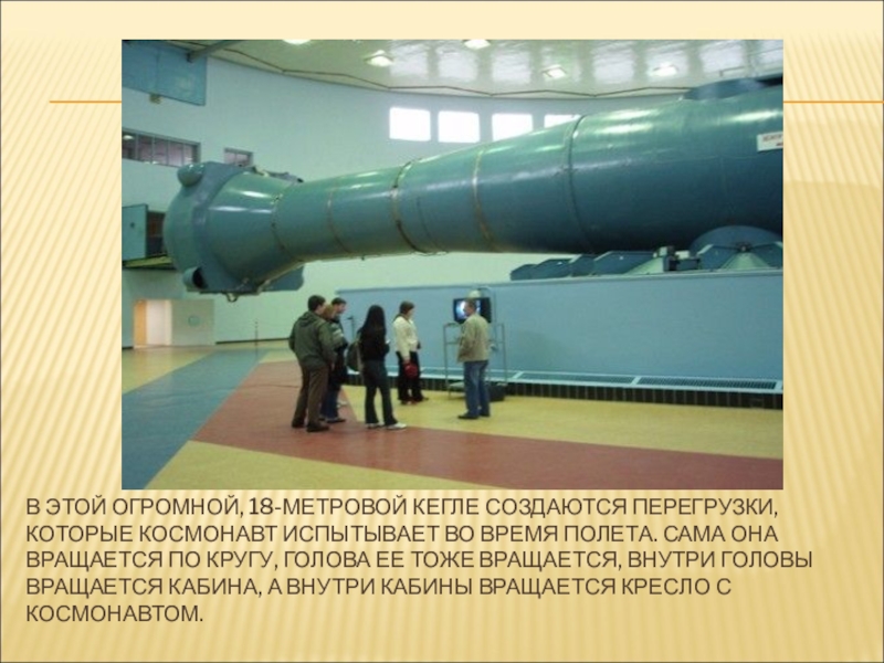 Слайд 8В этой огромной, 18-метровой кегле создаются перегрузки, которые космонавт испытывает во