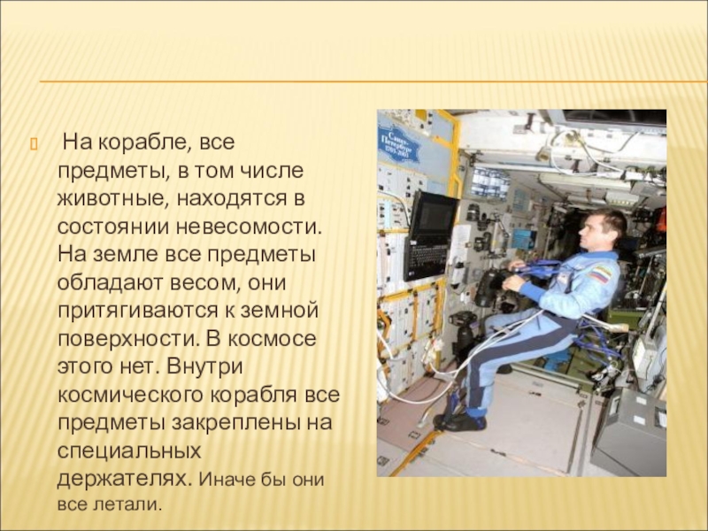Слайд 13 На корабле, все предметы, в том числе животные, находятся в