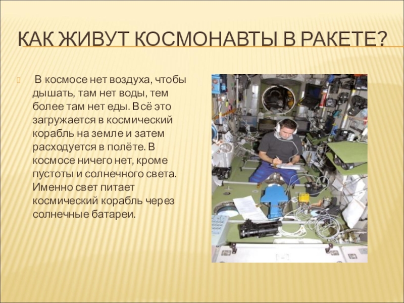 Как живут космонавты в ракете? В космосе нет воздуха, чтобы дышать, там нет воды, тем более там