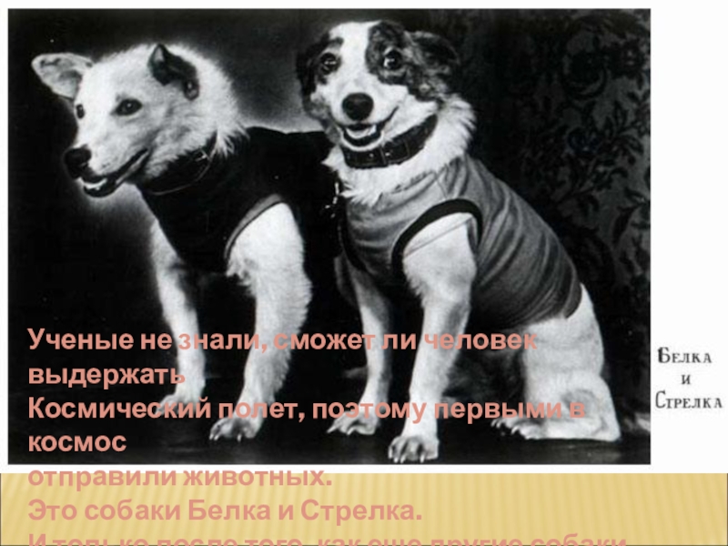 Ученые не знали, сможет ли человек выдержатьКосмический полет, поэтому первыми в космосотправили животных.Это собаки Белка и Стрелка.И