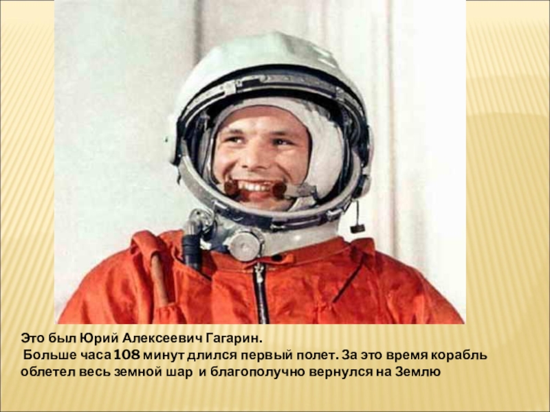 Это был Юрий Алексеевич Гагарин. Больше часа 108 минут длился первый полет. За это время корабль облетел