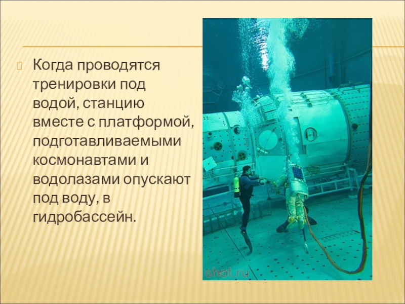 Слайд 9Когда проводятся тренировки под водой, станцию вместе с платформой, подготавливаемыми космонавтами