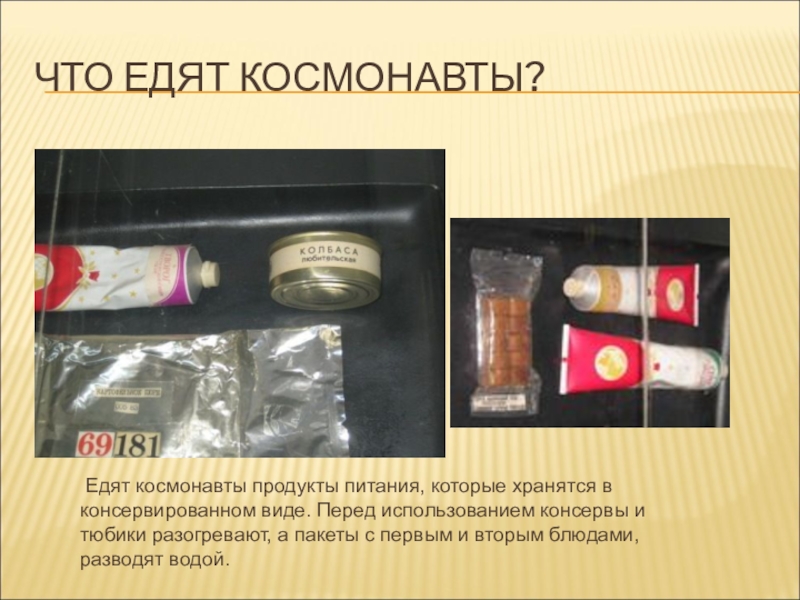 Что едят космонавты? Едят космонавты продукты питания, которые хранятся в консервированном виде. Перед использованием консервы и тюбики