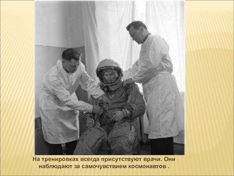Слайд 11На тренировках всегда присутствуют врачи. Они наблюдают за самочувствием космонавтов .