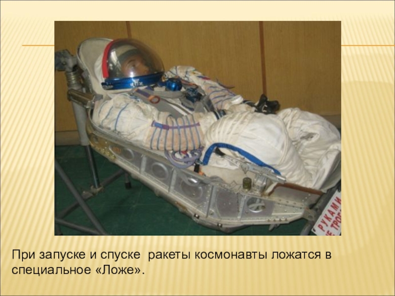 Слайд 15При запуске и спуске ракеты космонавты ложатся в специальное «Ложе».