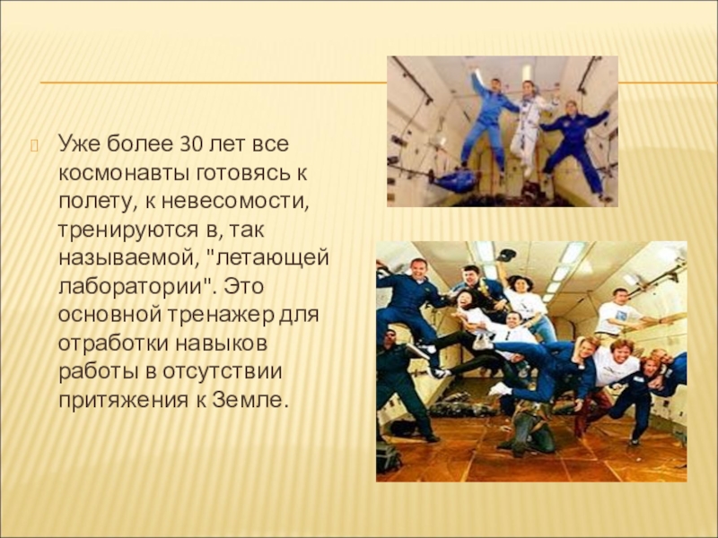 Слайд 10Уже более 30 лет все космонавты готовясь к полету, к невесомости,
