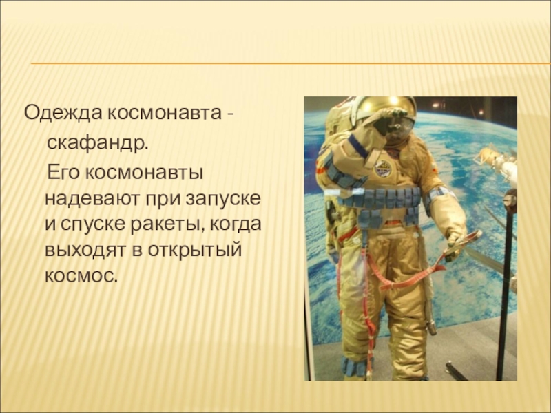 Одежда космонавта -   скафандр.    Его космонавты   надевают при запуске и