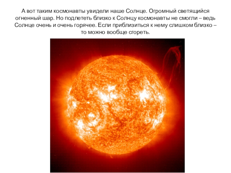 Слайд 13А вот таким космонавты увидели наше Солнце. Огромный светящийся огненный шар.