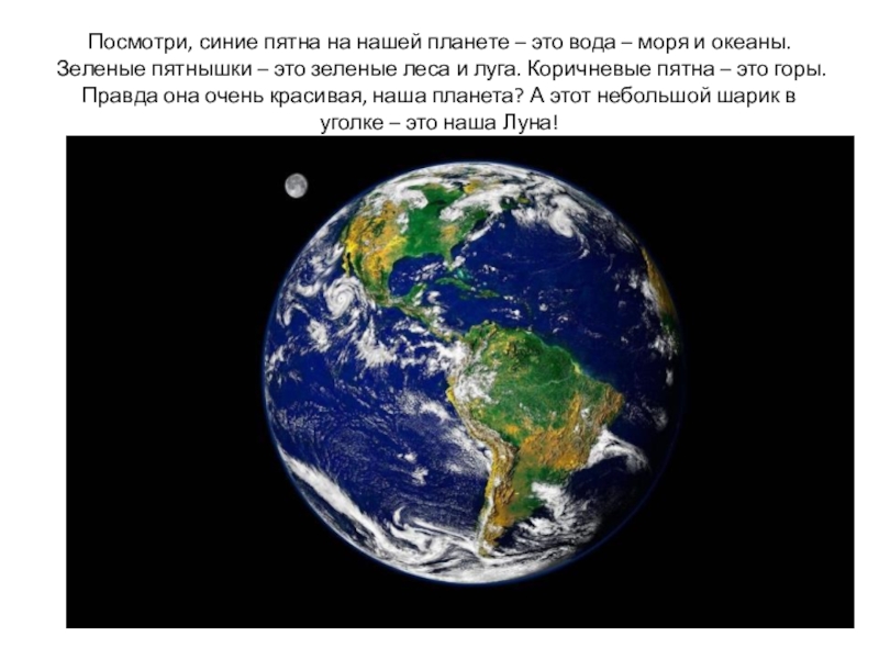 и океаны. Зеленые пятнышки – это зеленые леса и луга. Коричневые пятна – это горы. Правда она очень красивая, наша планета? А этот небольшой шарик в уголке – это наша Луна!