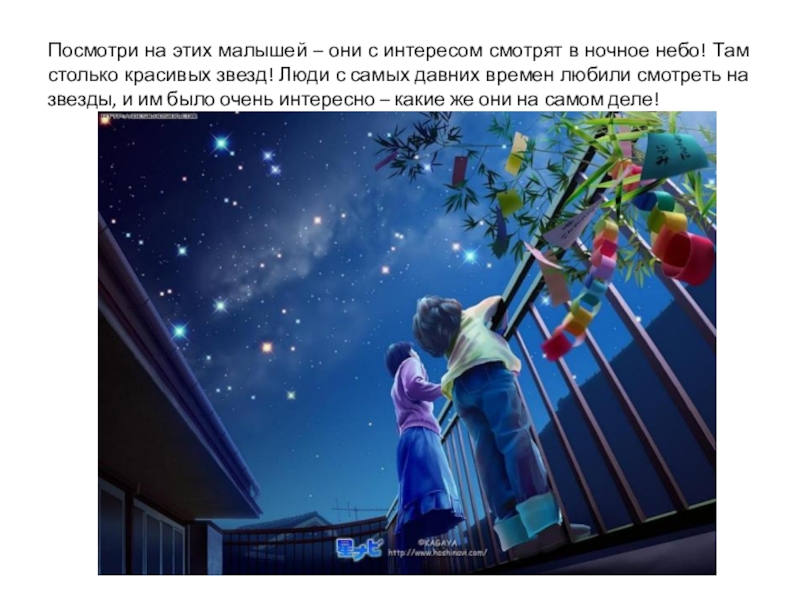 Посмотри на этих малышей – они с интересом смотрят в ночное небо! Там столько красивых звезд! Люди с самых давних времен любили смотреть на звезды, и им было очень интересно – какие же они на самом