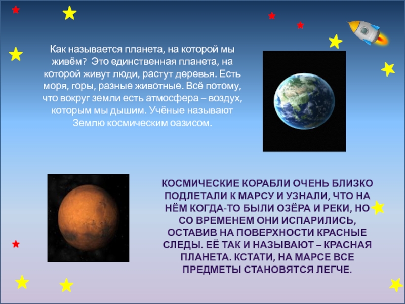 Космические корабли очень близко подлетали к Марсу и узнали, что на нём когда-то были озёра и реки, но со временем они испарились, оставив на поверхности красные следы. Её так и называют – Красная планета. Кстати, на Марсе все предметы становятся легче.