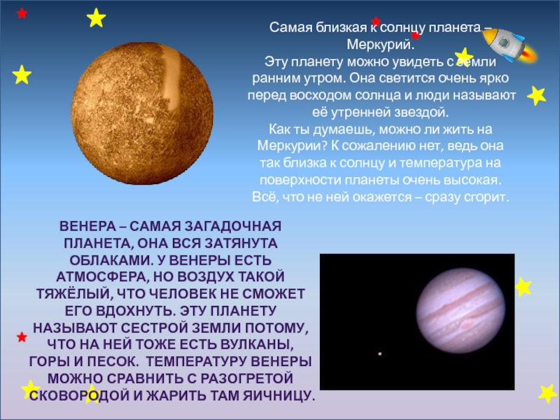 Венера – самая загадочная планета, она вся затянута облаками. У Венеры есть атмосфера, но воздух такой тяжёлый, что человек не сможет его вдохнуть. Эту планету называют сестрой Земли потому, что на ней тоже есть вулканы, горы и песок. Температуру Венеры можно сравнить с разогретой сковородой и жарить там яичницу.