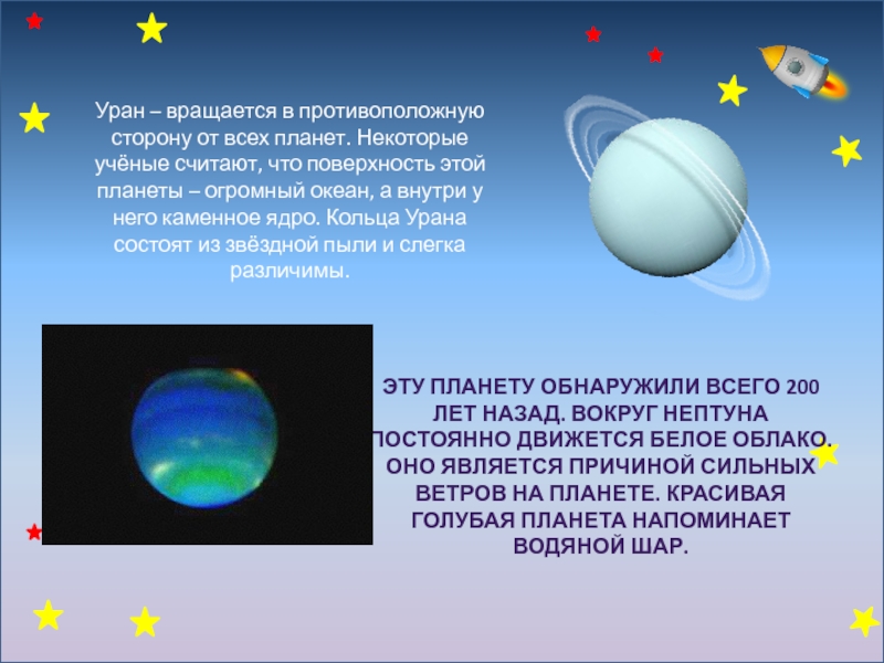 Эту планету обнаружили всего 200 лет назад. Вокруг Нептуна постоянно движется белое облако. Оно является причиной сильных ветров на планете. Красивая голубая планета напоминает водяной шар.