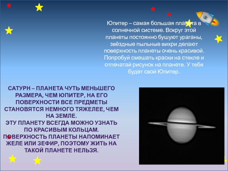 Эту планету всегда можно узнать по красивым кольцам. Поверхность планеты напоминает желе или зефир, поэтому жить на такой планете нельзя.