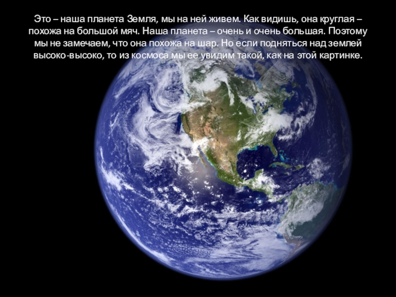Это – наша планета Земля, мы на ней живем. Как видишь, она круглая – похожа на большой