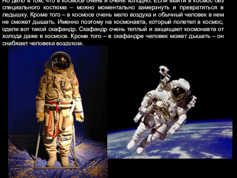Если выйти в космос без специального костюма – можно моментально замерзнуть и превратиться в ледышку. Кроме того – в космосе очень мало воздуха и обычный человек в нем не сможет дышать. Именно поэтому на космонавта, который полетел в космос, одели вот такой скафандр. Скафандр очень теплый и защищает космонавта от холода даже в космосе. Кроме того – в скафандре человек может дышать – он снабжает человека воздухом.