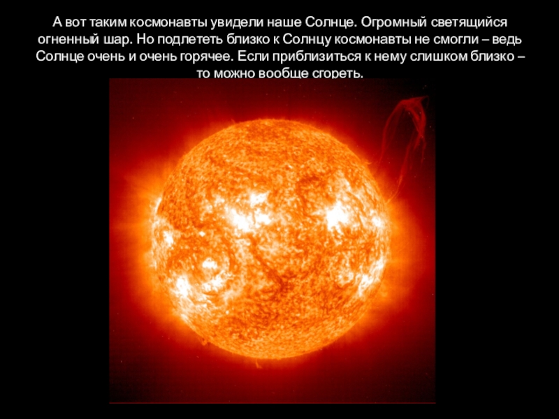 Слайд 13А вот таким космонавты увидели наше Солнце. Огромный светящийся огненный шар.