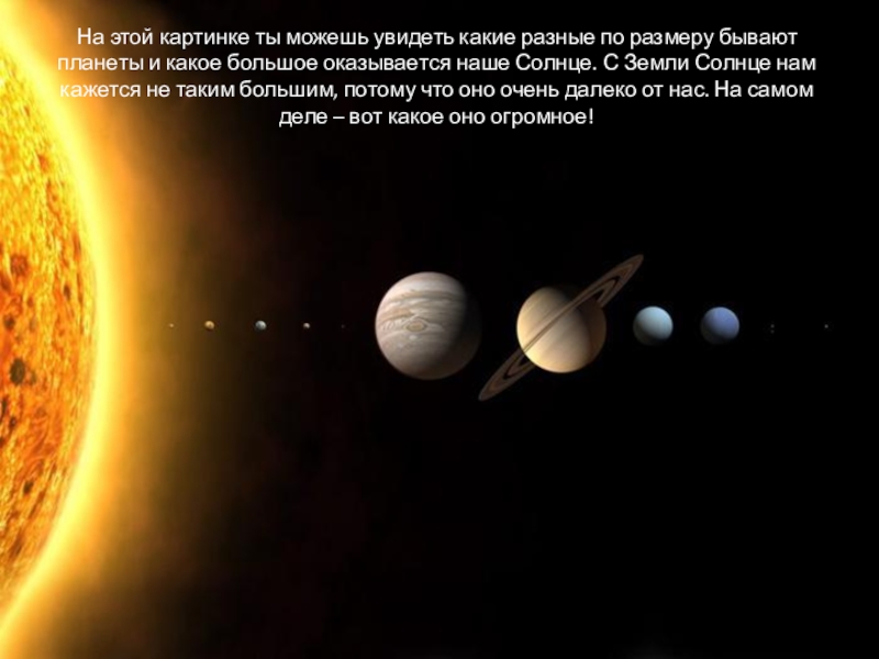 планеты и какое большое оказывается наше Солнце. С Земли Солнце нам кажется не таким большим, потому что оно очень далеко от нас. На самом деле – вот какое оно огромное!