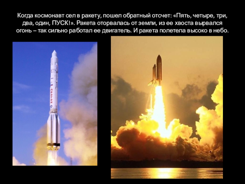 Слайд 6Когда космонавт сел в ракету, пошел обратный отсчет: «Пять, четыре, три,