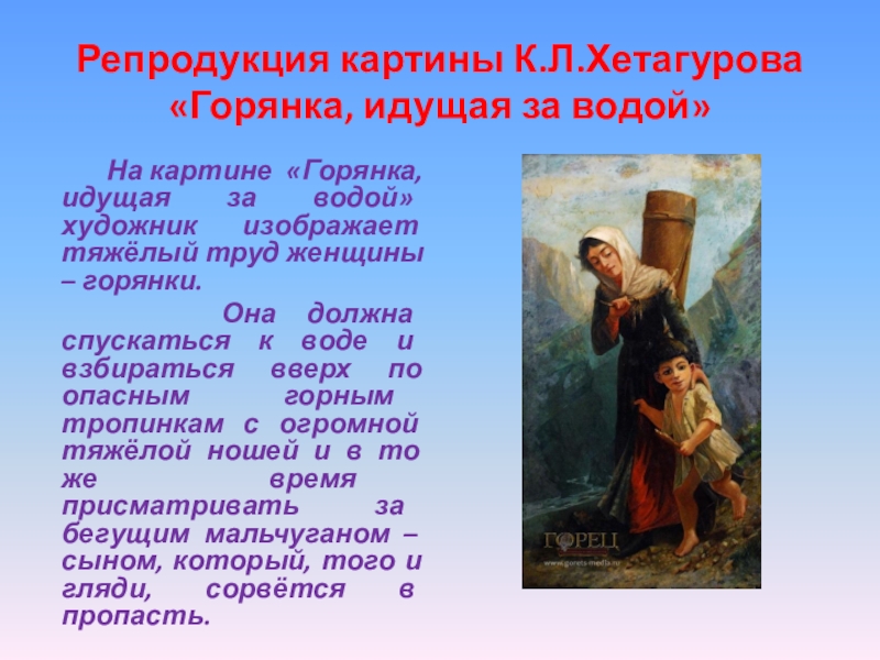 На картине «Горянка, идущая за водой» художник изображает тяжёлый труд женщины – горянки.