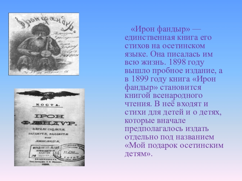 на осетинском языке. Она писалась им всю жизнь. 1898 году вышло пробное издание, а в 1899 году книга «Ирон фандыр» становится книгой всенародного чтения. В неё входят и стихи для детей и о детях, которые вначале предполагалось издать отдельно под названием «Мой подарок осетинским детям».