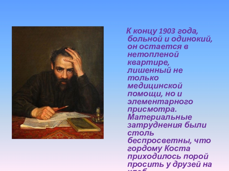 в нетопленой квартире, лишенный не только медицинской помощи, но и элементарного присмотра. Материальные затруднения были столь беспросветны, что гордому Коста приходилось порой просить у друзей на хлеб