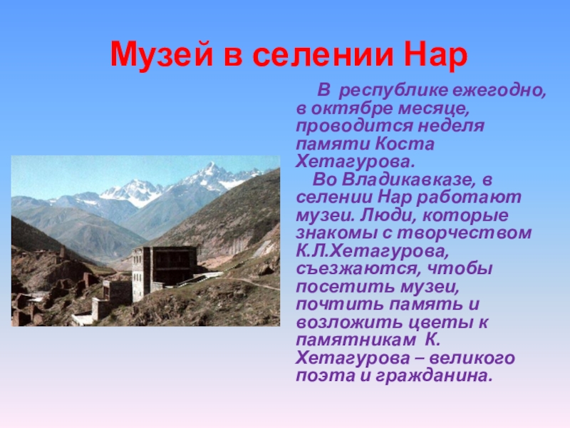 Во Владикавказе, в селении Нар работают музеи. Люди, которые знакомы с творчеством К.Л.Хетагурова, съезжаются, чтобы посетить музеи, почтить память и возложить цветы к памятникам К.Хетагурова – великого поэта и гражданина.