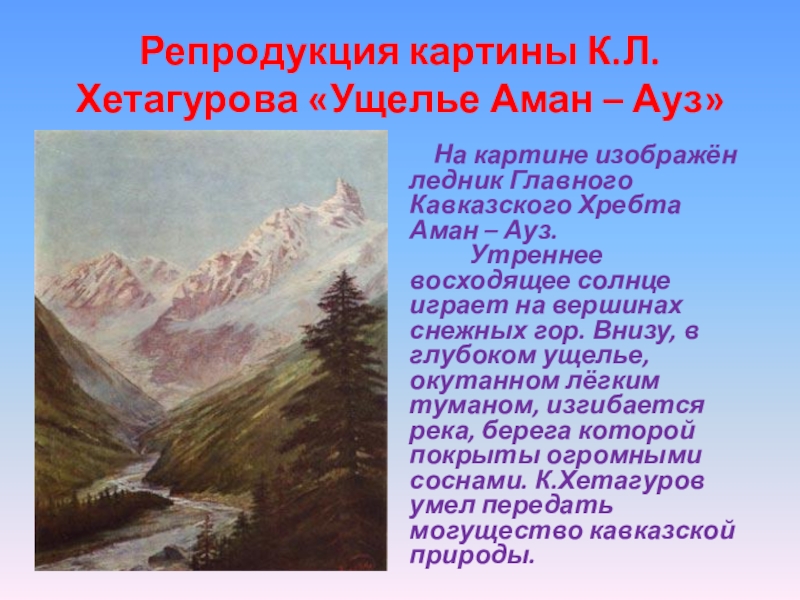 Слайд 7Репродукция картины К.Л.Хетагурова «Ущелье Аман – Ауз»
