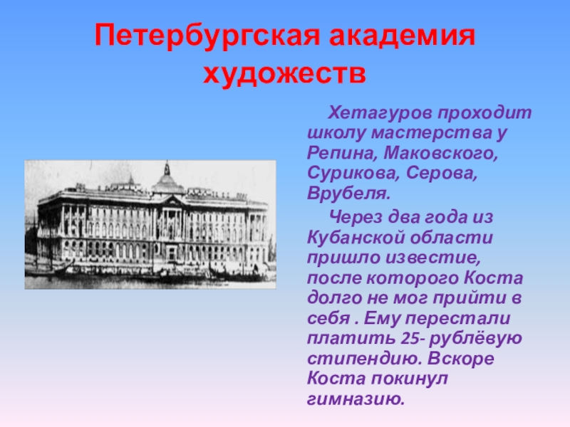 Через два года из Кубанской области пришло известие, после которого Коста долго не мог прийти в себя . Ему перестали платить 25- рублёвую стипендию. Вскоре Коста покинул гимназию.