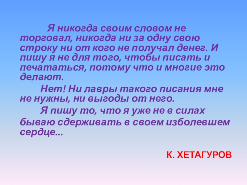 торговал, никогда ни за одну свою строку ни от кого не получал денег. И пишу я не для того, чтобы писать и печататься, потому что и многие это делают.