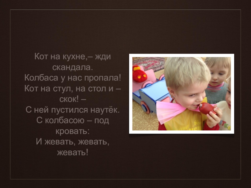 Слайд 10Кот на кухне,– жди скандала. Колбаса у нас пропала! Кот на стул, на