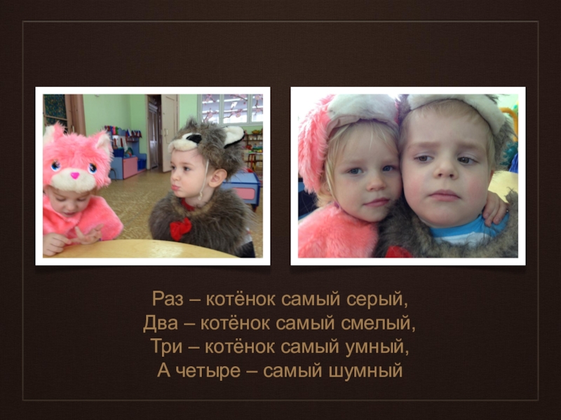 Раз – котёнок самый серый,Два – котёнок самый смелый,Три – котёнок самый умный,А четыре – самый шумный